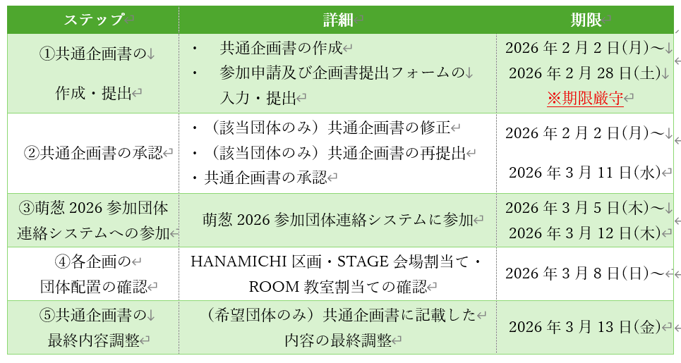 萌葱2026の各企画に参加を希望する団体は、以下の手順にしたがって参加手続を行ってください。参加手続はステップのとおりに進行します。前のステップが完了しない限り、次のステップに進むことはできません。以下のすべてを完了した団体のみが、萌葱2026に参加することができます。